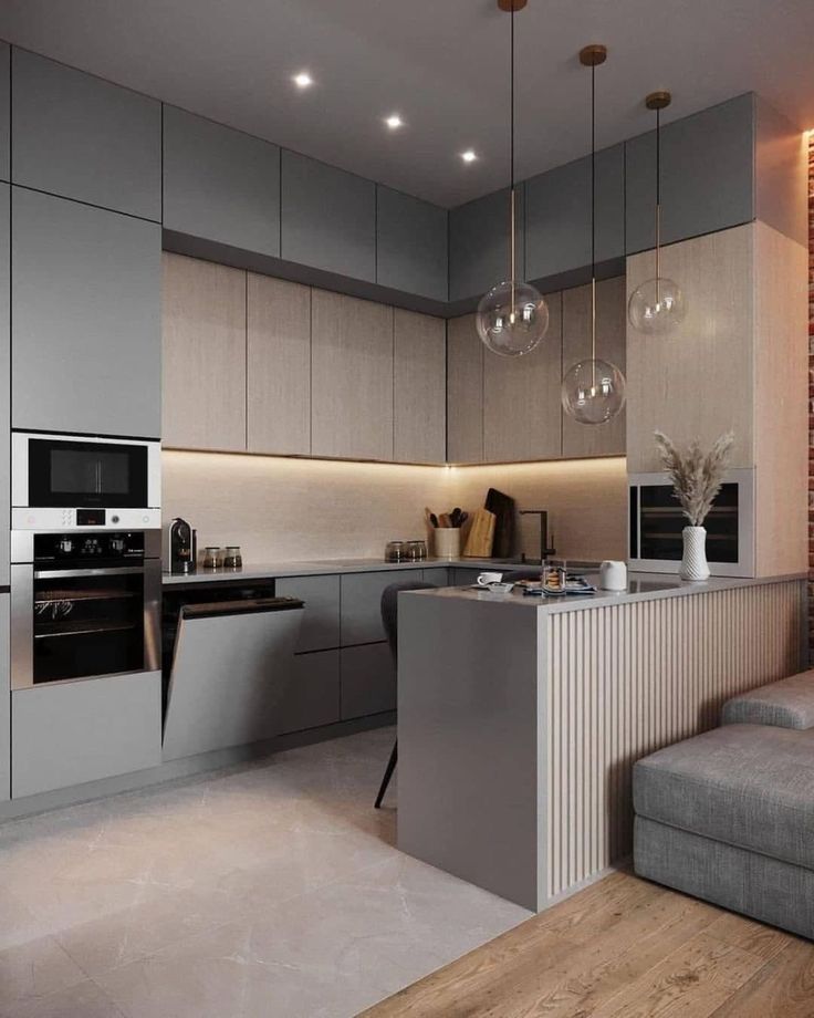 Efficient corner layout ideal for maximizing counter space in medium-sized kitchens. Stylish and ergonomic.